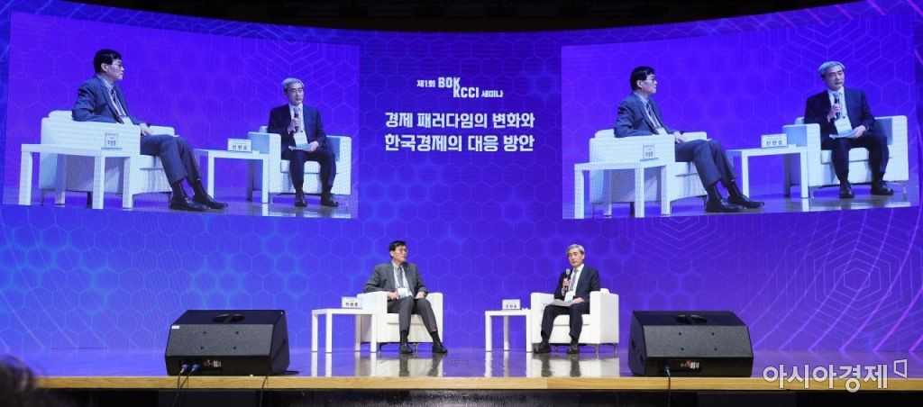 이창용 한국은행 총재와 신현송 BIS 경제보좌관 겸 조사국장이 1일 서울 중구 대한상공회의소에서 '경제 패러다임의 변화와 한국경제의 대응 방안'을 주제로 열린 제1회 한국은행-대한상의 공동세미나에서 대담을 하고 있다. 사진=김현민 기자 kimhyun81@