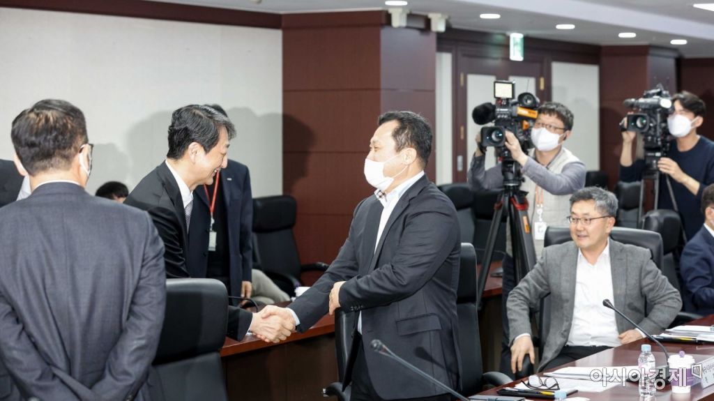 안덕근 산업통상자원부 통상교섭본부장이 1일 서울 종로구 무역보험공사에서 열린 '수출상황 점검회의'에서 참석자들과 인사하고 있다. 사진=강진형 기자aymsdream@