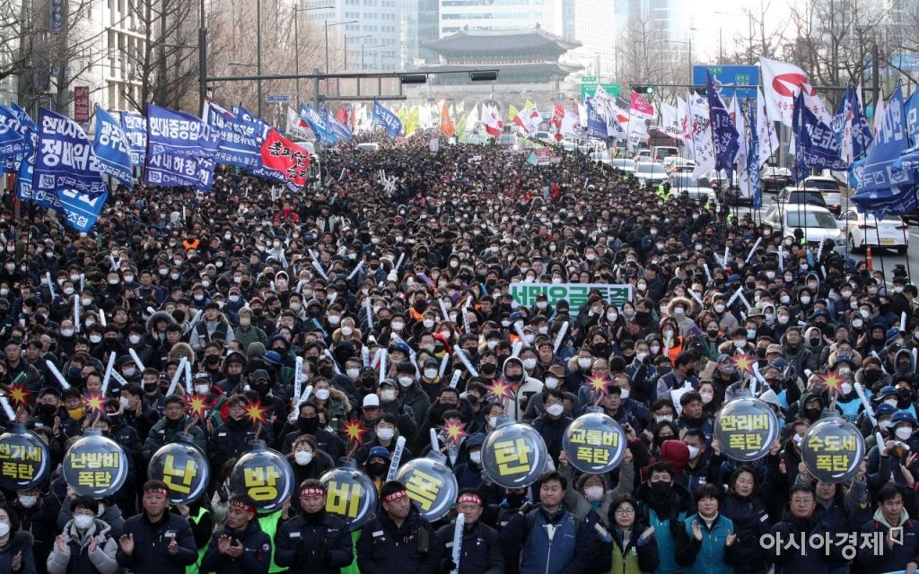 민주노총 조합원들이 1일 서울 중구 태평로 일대에서 열린 '노조법 개정 및 노동탄압 저지 촉구 결의대회'에서 구호를 외치고 있다. 사진=김현민 기자 kimhyun81@