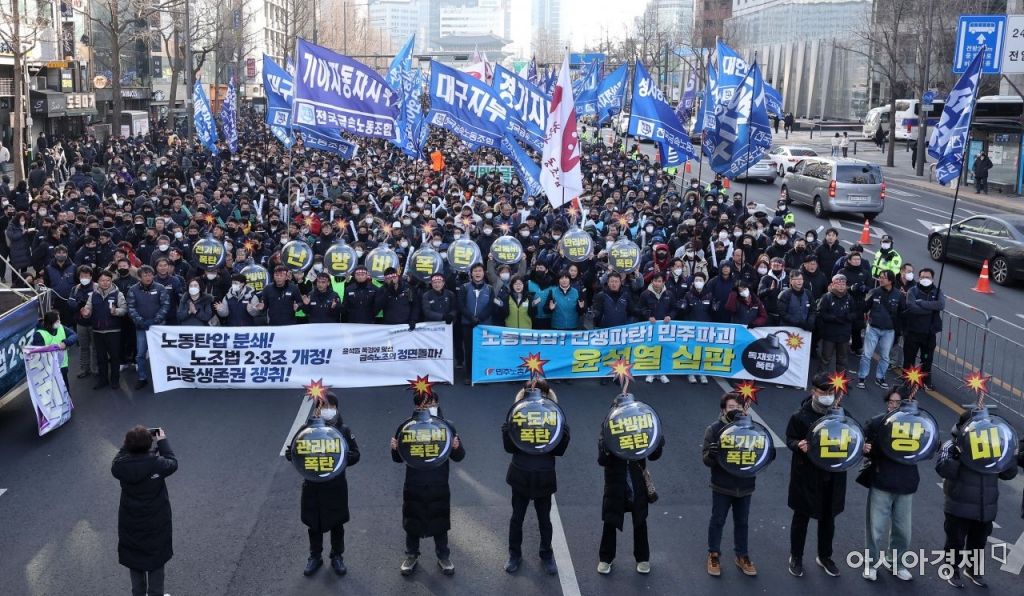 민주노총 조합원들이 1일 서울 중구 태평로 일대에서 열린 '노조법 개정 및 노동탄압 저지 촉구 결의대회'에서 구호를 외치고 있다. 사진=김현민 기자 kimhyun81@