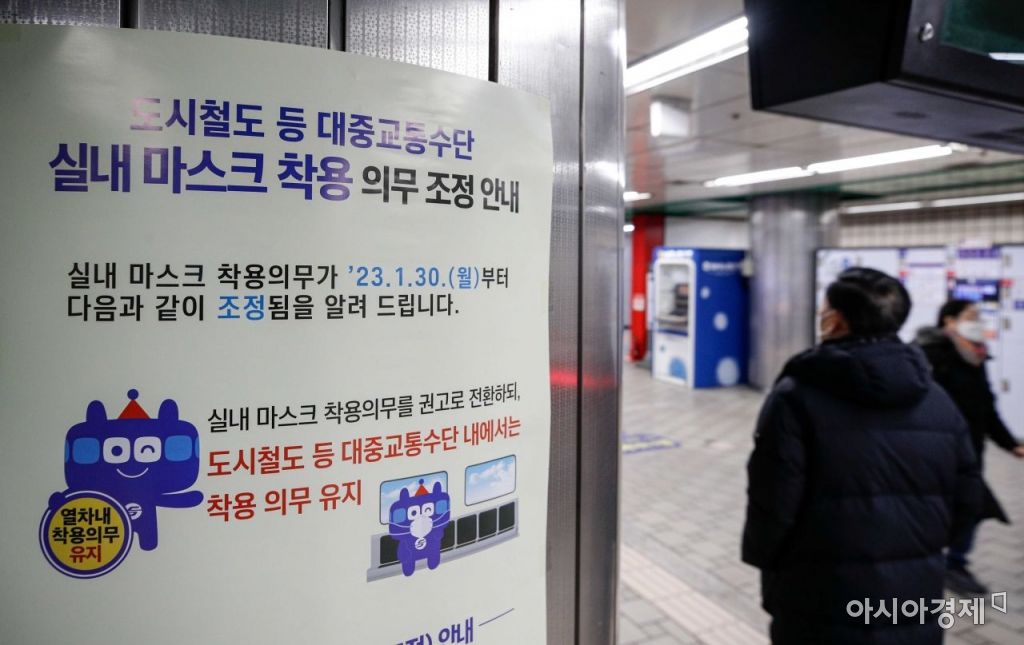 서울 서대문구 지하철2호선 신촌역에 대중교통수단 실내 마스크 착용 의무 조정 안내문이 붙어 있다. 사진=강진형 기자aymsdream@