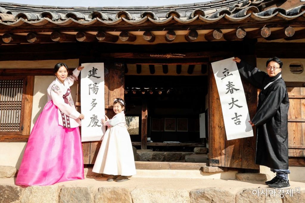 절기상 입춘을 이틀 앞둔 2일 서울 종로구 국립민속박물관 오촌댁에서 시민들이 입춘첩을 대문에 붙이고 있다. 사진=강진형 기자aymsdream@