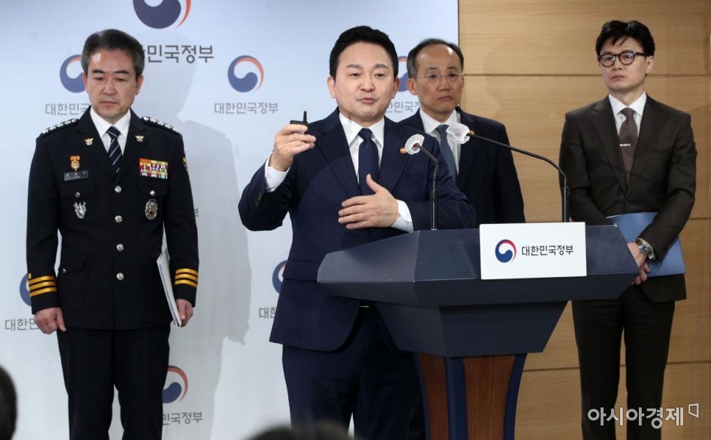 원희룡 국토부 장관이 2일 서울 종로구 정부서울청사에서 전세사기 대책 관련 합동브리핑을 하고 있다. 이날 브리핑에는 추경호 부총리 겸 기재부 장관과 원희룡 국토부 장관과 한동훈 법무부 장관, 윤희근 경찰청장이 참석했다. 사진=김현민 기자 kimhyun81@
