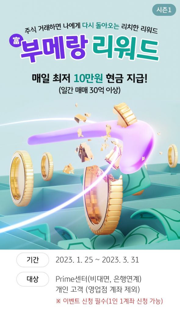 이벤트에 참여한 고객의 국내 주식 일 거래금액이 ▲200억 이상인 경우 100만원 ▲150억 이상 200억 미만인 경우 50만원 ▲100억 이상 150억 미만인 경우 30만원 ▲60억 이상 100억 미만인 경우 20만원 ▲30억 이상 60억 미만인 경우 10만원의 현금 캐시백 혜택을 제공한다. 일별 중복 혜택은 가능하지만, 일간 매매금액 구간별 중복은 불가능하며, 제세공과금 22%는 고객 부담이다.