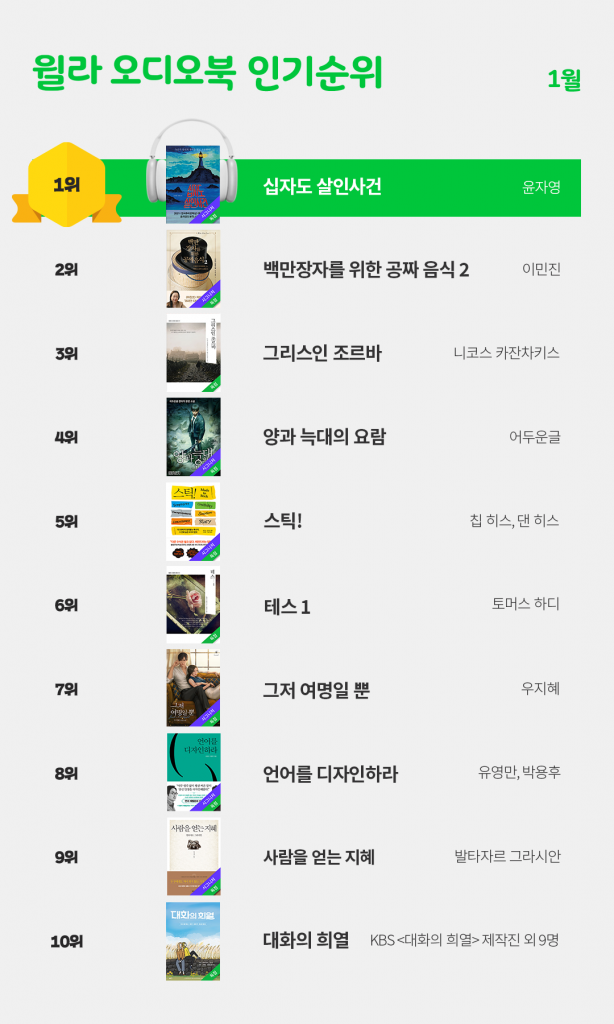 이 외에도 다양한 작품이 사랑받았다. ‘세계문학컬렉션’을 통해 소개된 고전 '그리스인 조르바'와 '테스'가 각각 3위와 6위를 차지했고, 전 세계 비즈니스맨들의 바이블로 자리잡은 광고 카피의 원칙을 세운 '스틱!'은 5위에 이름을 올렸다. 삶을 디자인하는 언어 사용법을 담은 '언어를 디자인하라'(8위)와 KBS ‘대화의 희열’ 출연자들의 솔직한 이야기를 모은 '대화의 희열'(10위)도 1월 한 달간 윌라 구독자들의 관심을 받았다.