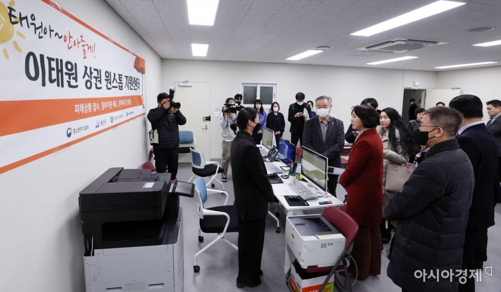 이영 중소벤처기업부 장관이 3일 서울 용산구청에 마련된 '이태원 상권 원스톱지원센터'를 찾아 직원들을 격려하고 있다. 원스톱지원센터는 이태원의 경영 위기 소상공인·자영업자를 위해 정부·유관기관 지원 내용에 대한 현장 안내, 경영 관련 애로·건의 사항에 대한 상담·답변, 애로·건의 사항의 소관 기관 전달·검토 결과 답변 등의 업무를 수행한다. 사진=김현민 기자 kimhyun81@