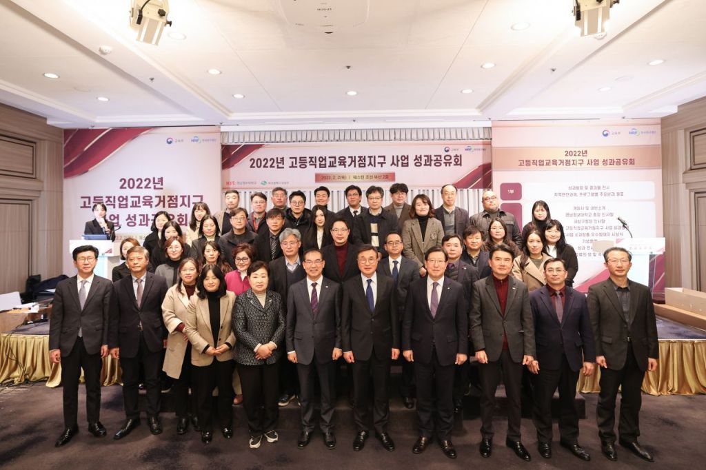 경남정보대 김대식 총장(맨 앞줄 오른쪽부터 5번째) 등 ‘2022년 고등직업교육거점지구(HiVE)사업성과공유회’ 참가자들이 단체 기념사진을 찍고 있다.