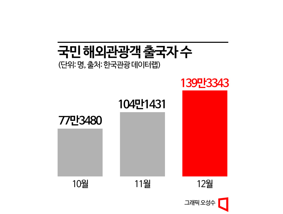 이는 하늘길이 본격적으로 열리면서 가까운 일본과 동남아로 떠나는 관광객이 늘었기 때문이다. 지난해 10월 일본이 외국인 관광객의 무비자 입국과 개인 자유 여행을 허용했고 동남아로 가는 비행기 편도 많아졌다. 한국관광 데이터랩이 조사한 한국관광통계에 따르면 국민 해외관광객은 ▲10월 77만3480명 (전년 동월 대비 521.8% 증가) ▲11월 104만1431명 (전년 동월 대비 604.1% 증가) ▲12월 139만3343명 (전년 동월 대비 899.3% 증가) 출국했다.