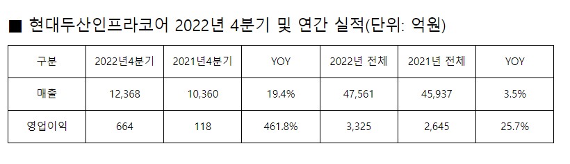 현대두산인프라코어의 지난해 실적은 매출액 4조7561억원, 영업이익 3325억원이다. 2021년과 비교해 매출은 3.5%, 영업이익은 25.7% 증가했다. 특히 4분기 실적이 좋았다. 4분기 매출이 19.4% 늘어난 1조 2368억원, 영업이익은 461.8% 증가한 664억원을 기록했다.