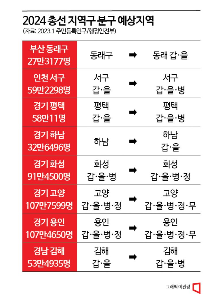 특히 선거구 분구, 즉 선거구가 늘어날 것으로 예상되는 지역이 경기도에 집중돼 있다는 점도 눈여겨볼 부분이다.