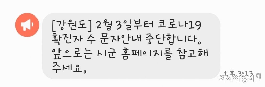 강원도는 "작년 2월부터 코로나19 확진자 수를 알리는 재난 문자 발송을 중단했고, 3일부터는 모든 시·군도 재난 문자 발송을 중단하기로 결정했다"고 이날 밝혔다.