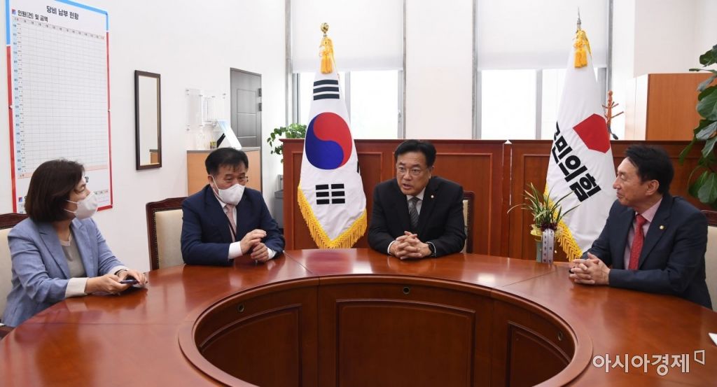 정진석 국민의힘 비상대책위원장이 14일 국회에서 이진복 대통령실 정무수석과 전희경 정무1비서관을 접견하고 있다./윤동주 기자 doso7@