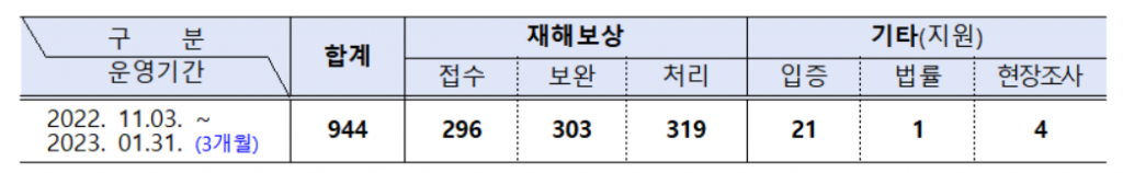 이후 지난해 11월 3일부터 올해 1월 31일까지 재해보상 관련 전체 업무건수는 944건으로 접수 296건, 보완 303건, 처리319건, 기타(입증지원·법률지원·현장조사) 26건이었다.