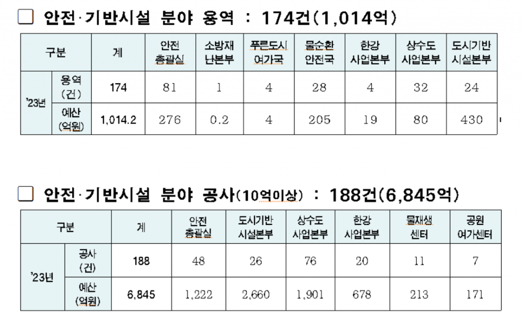 우선 안전·기반시설 분야 발주 용역은 ▲도로시설·소방·산지 등 안전 분야 86건(280억원) ▲상하수도 안전관리 64건(304억원) ▲기반시설 설계 24건(430억원) 등 총 174건이며, 사업비는 1,014억 원이다.