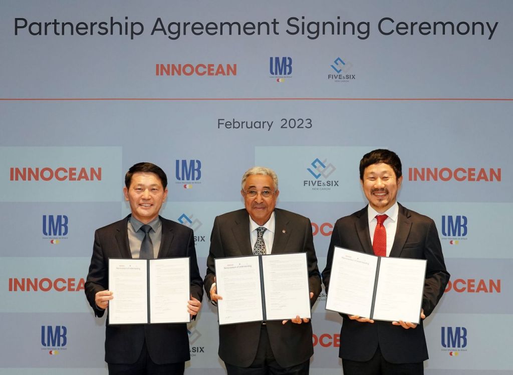 (왼쪽부터)이용우 이노션 대표, 파루크 바르키 UMB 회장, 오성규 파이브앤식스 대표가 스포츠 마케팅 협업을 위한 양해각서 체결 후 기념사진을 찍고 있다(사진=이노션 제공).