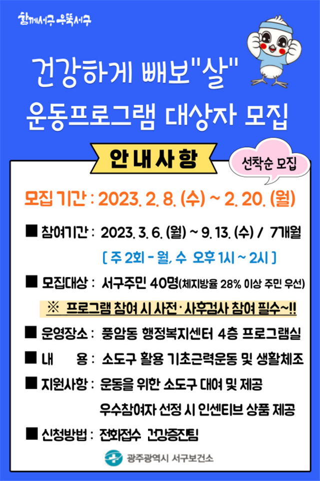 [아시아경제 호남취재본부 신동호 기자] 광주광역시 서구는 오는 8일부터 20일까지 대면 운동프로그램 ‘건강하게 빼보살’ 참여자를 선착순으로 40명을 모집한다고 6일 밝혔다.