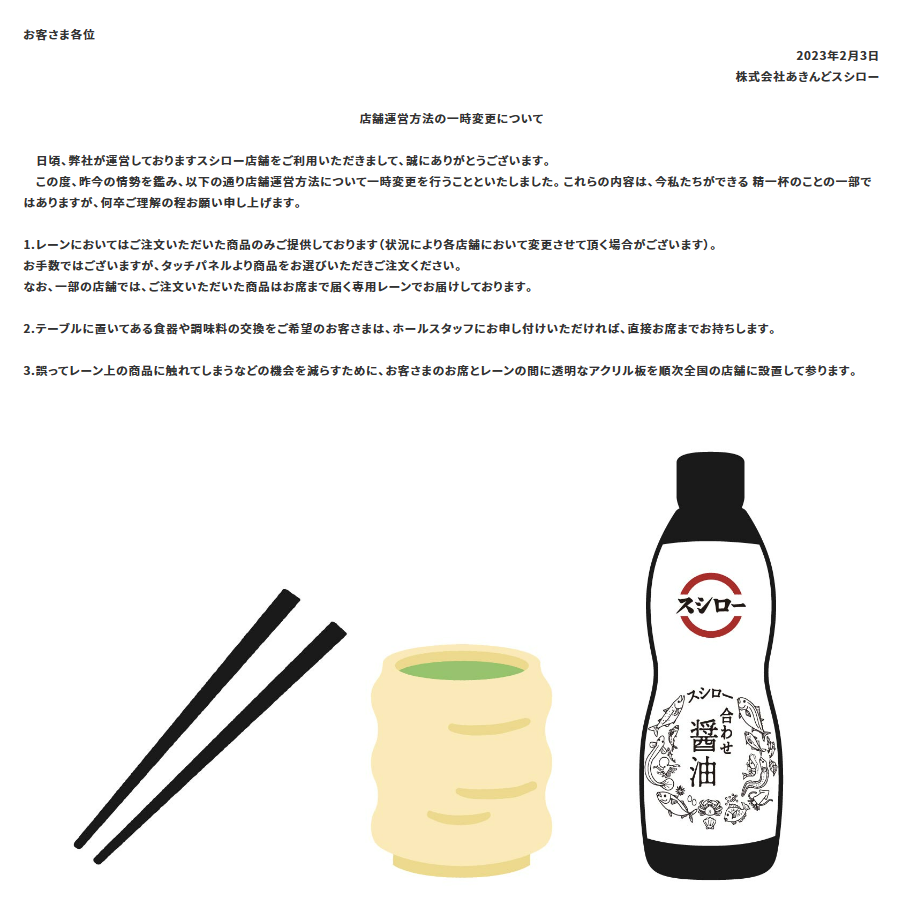 일본 회전초밥 프랜차이즈 스시로의 공지사항. '손님 테러' 사건 이후로 손님이 주문한 초밥만 레인에 올라가며, 식기나 조미료는 직접 종업원이 손님에게 가져다 준다는 내용을 담고 있다.[이미지출처=일본 스시로 공식 홈페이지]