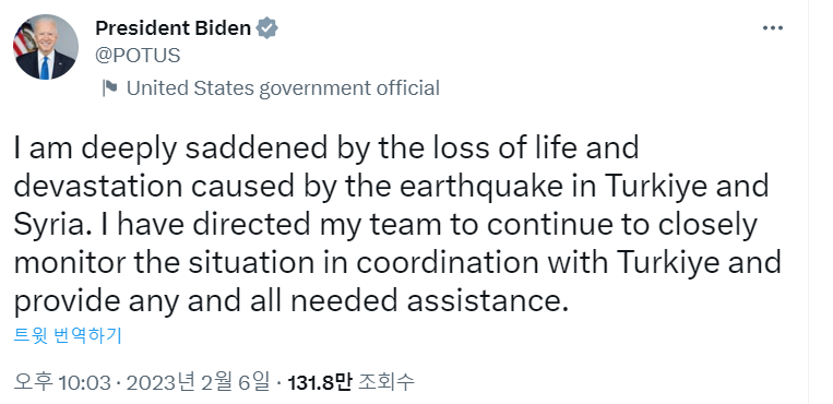 6일(현지시간) 바이든 대통령은 자신의 공식 트위터 계정을 통해 "튀르키예와 시리아의 지진 피해자들에게 깊은 애도를 표한다"라며 "튀르키예 상황을 긴밀히 파악하면서 가능한 모든 지원을 아끼지 말라고 지시했다"고 밝혔다.