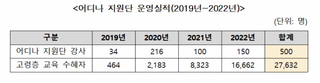 '어디나지원단'은 2019년부터 5년간 운영 중인 서울시 대표 디지털 역량강화 사업으로, 스마트폰ㆍ키오스크 등 디지털 기기 활용에 어려움을 겪는 어르신에게 교육을 제공하는 강사를 칭한다.