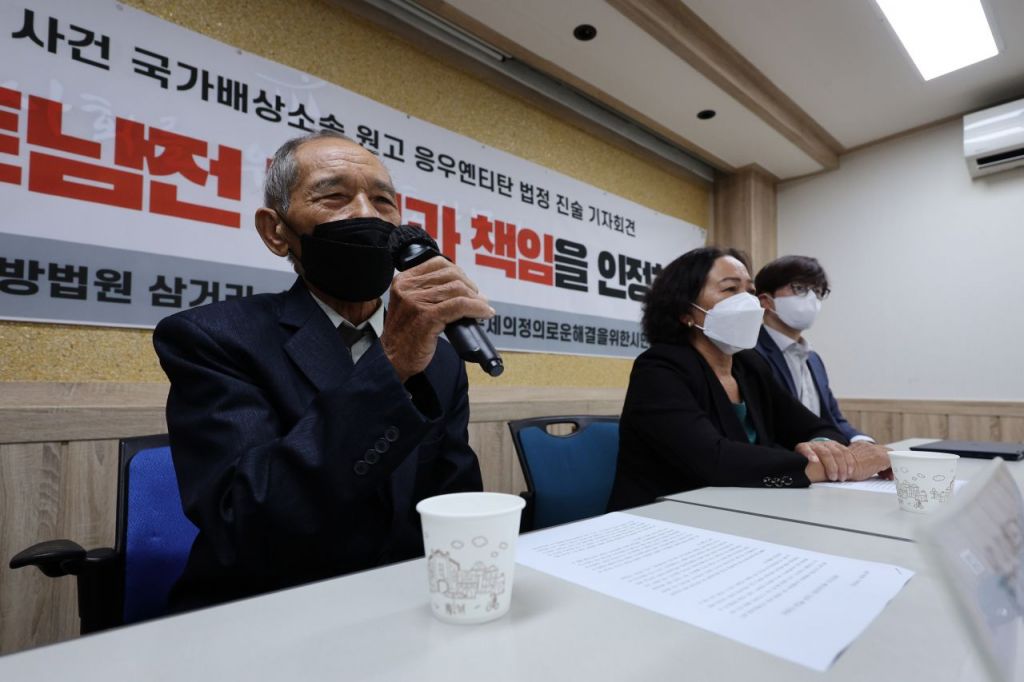 베트남전쟁 당시 한국군의 민간인 학살 피해 목격자인 응우옌 득쩌이 씨(왼쪽)가 지난해 8월9일 오후 서울 서초구 민주사회를위한변호사모임 대회의실에서 베트남전 민간인학살 국가배상 소송 법정 진술 기자회견을 하고 있다. [이미지출처=연합뉴스]