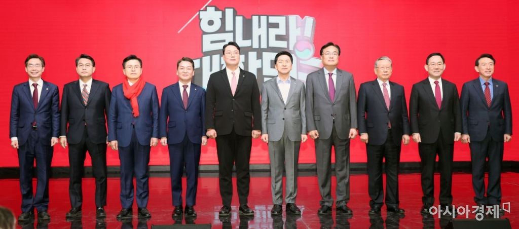 7일 서울 강서구 한 방송 스튜디오에서 열린 국민의힘 제3차 전당대회 후보자 비전 발표회에서 정진석 비대위원장, 주호영 원내대표 등 당 지도부와 당 대표 후보들이 기념촬영을 하고 있다. 왼쪽부터 조경태, 윤상현, 황교안, 안철수, 천하람, 김기현 당 대표 후보, 정진석 비상대책위원장, 유흥수 전당대회 선거관리위원장, 주호영 원내대표, 김석기 사무총장. 사진=국회사진기자단