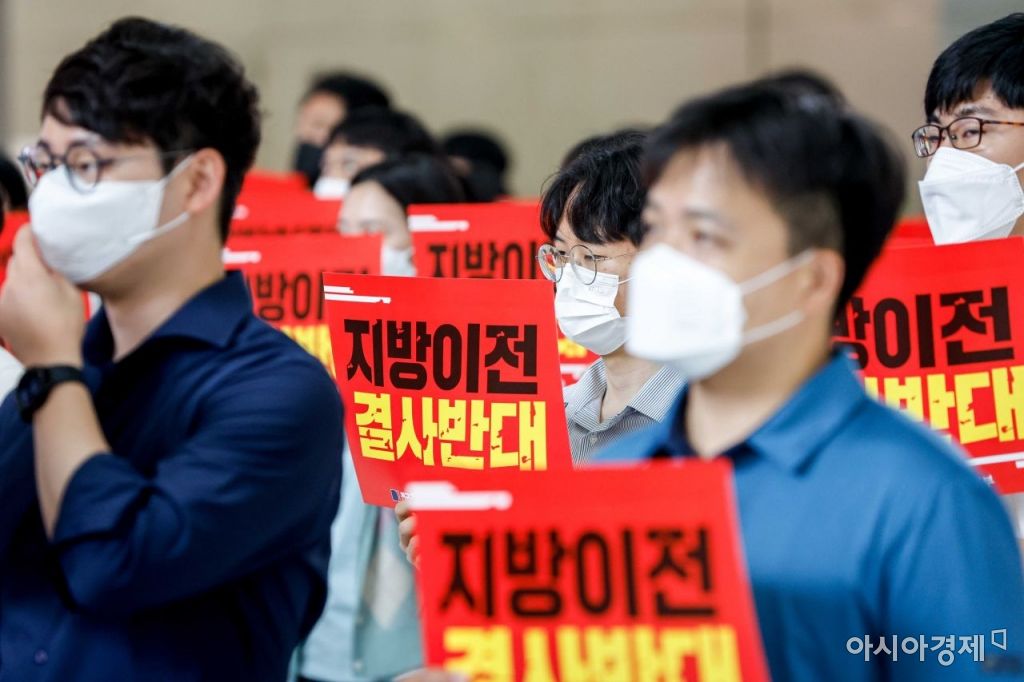 산은 노조는 "강석훈 산은 회장이 업무상 필요성이 없음에도 '본점을 서울특별시에 둔다'라는 산은법 조항을 위반해 본점 부서를 부산으로 이전하고 직원 45명을 발령 내는 등 불법 행위를 자행하고 있다"고 했다.