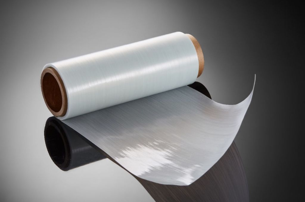 테이프 형태로 만든 뒤 열을 식히면 얇은 실 모양 유리섬유가 장판처럼 널따란 UD테이프가 된다. 무한정 길게 뽑을 수도 있다. 이 회사만의 노하우다.