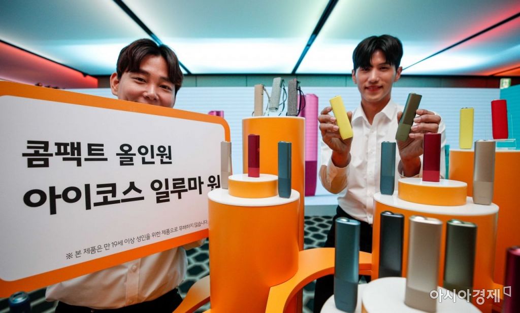 8일 서울 중구 플라자호텔에서 홍보 모델들이 차세대 궐련형 전자담배 기기 신제품 '아이코스 일루마 원'을 선보이고 있다.