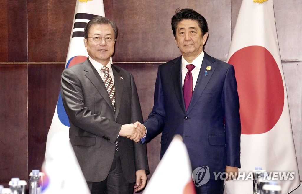 문재인 전 대통령과 아베 신조 전 일본 총리가 2019년 12월24일(현지시간) 중국 쓰촨성 청두 세기성 샹그릴라호텔에서 악수를 나누고 있다. [이미지출처=연합뉴스]