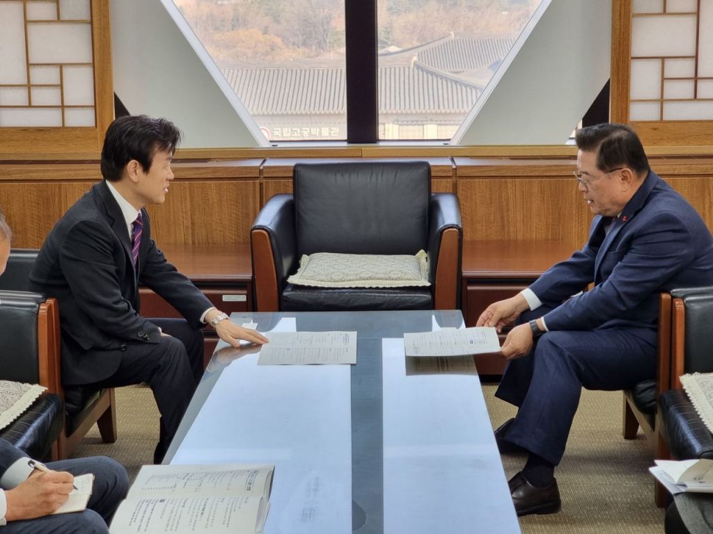 조규일 경남 진주시장이 우동기 위원장을 만나 면담을 하고 있다.