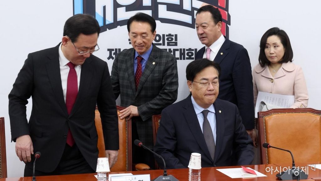 정진석 국민의힘 비대위원장 주호영 원내대표 등 당 지도부가 9일 서울 여의도 국회에서 열린 비상대책위원회의에 참석하고 있다. 사진=김현민 기자 kimhyun81@