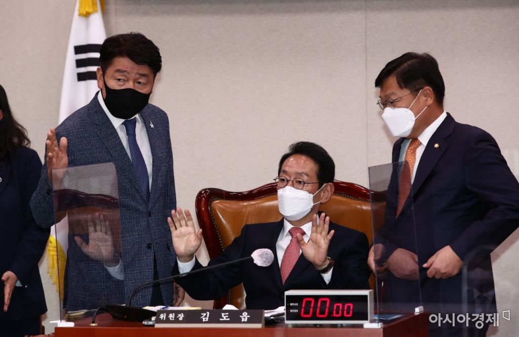 김도읍 국회 법사위원장이 지난해 10월 24일 국회에서 열린 법무부 등에 대한 국정감사에서 감사 시작 전 기동민 더불어민주당 간사, 정점식 국민의힘 간사와 이야기를 나누고 있다./윤동주 기자 doso7@