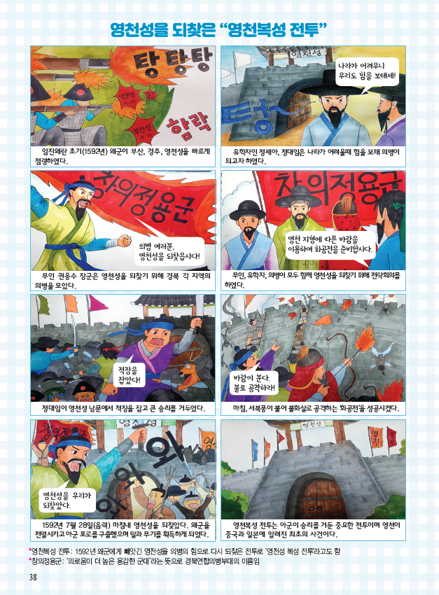 임란영천성수복대첩은 이 교과서의 2단원 중 ‘우리 고장의 옛이야기’ 부문에 초등학교 저학년이 영천의병 역사에 대해 이해하기 쉽도록 만화삽화 형식으로 실렸다.