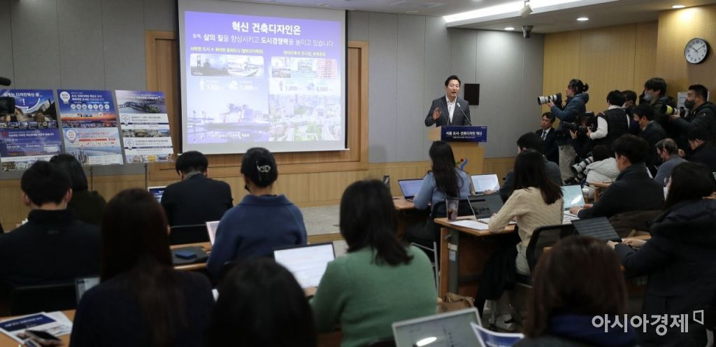 오세훈 서울시장이 9일 서울시청에서 도시건축 디자인 혁신 기자 설명회를 하고 있다. 사진=윤동주 기자 doso7@