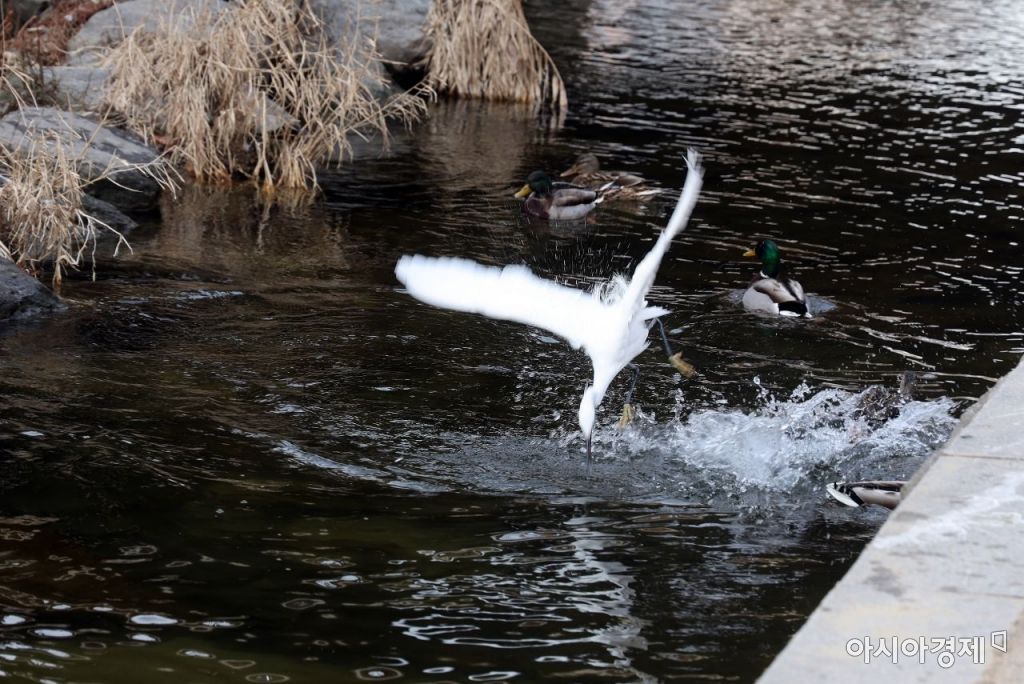 최고 기온이 영상 9도 까지 올라간 9일 얼음이 완전히 녹은 서울 청계천에서 백로가 물고기를 사냥하고 있다. 사진=허영한 기자 younghan@