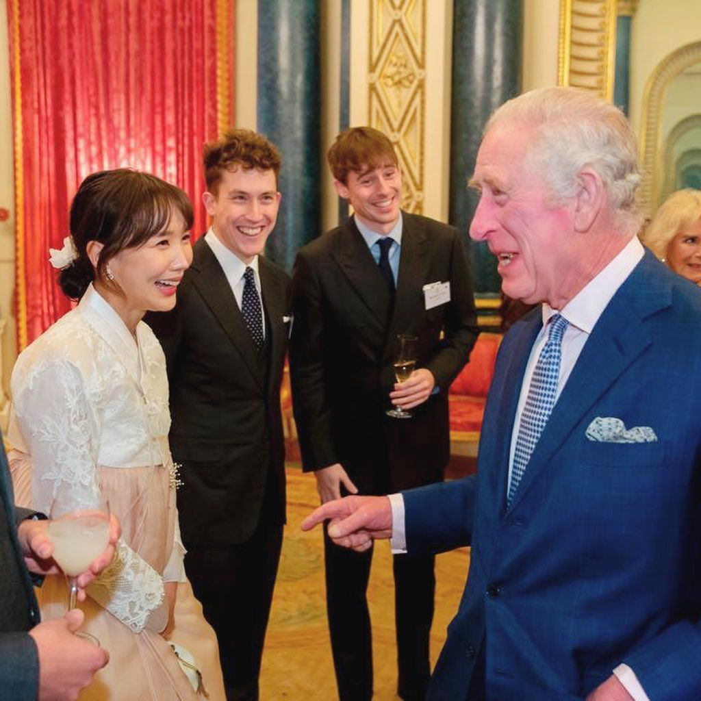 찰스 3세 영국 국왕(오른쪽)이 '영국남자' 조쉬(가운데), 그의 부인인 요리연구가 국가비(왼쪽) 등과 만나 이야기를 나누고 있다. / 사진=국가비 인스타그램