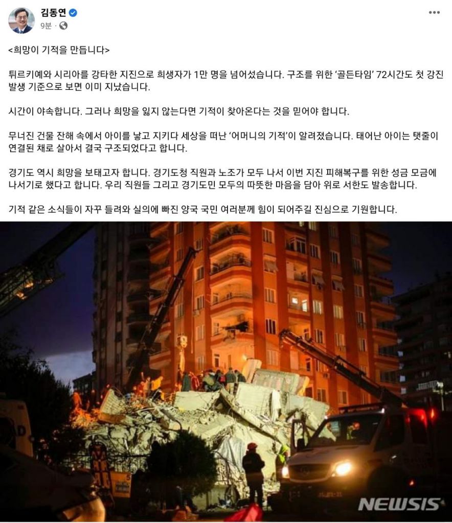 김 지사는 9일 자신의 사회적 관계망(SNS)에 올린 글을 통해 "튀르키예와 시리아를 강타한 지진으로 희생자가 1만 명을 넘어섰다"며 "구조를 위한 '골든타임' 72시간도 첫 강진 발생 기준으로 보면 이미 지났다"고 안타까움을 토로했다.