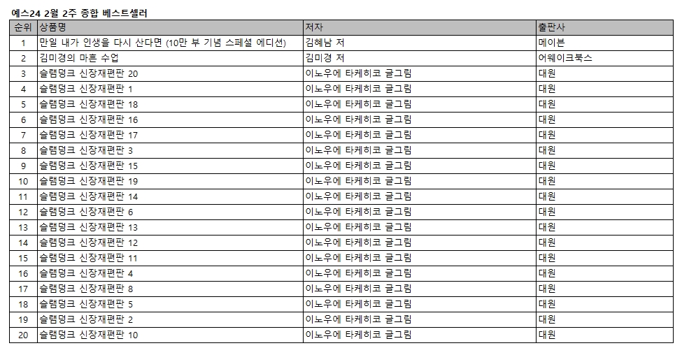 극장과 서점가를 넘어 트렌드가 되고 있는 ‘슬램덩크’ 열풍이 거세다. 종합 3위부터 상위권을 '슬램덩크 신장재편판'이 차지했다. '슬램덩크 신장재편판 20 : 북산vs.산왕공고 5(완결)'이 3위에 올랐고, '슬램덩크 신장재편판 1 : 강백호'가 4위, '슬램덩크 신장재편판 18 : 북산vs.산왕공고 3'가 5위를 기록했다.