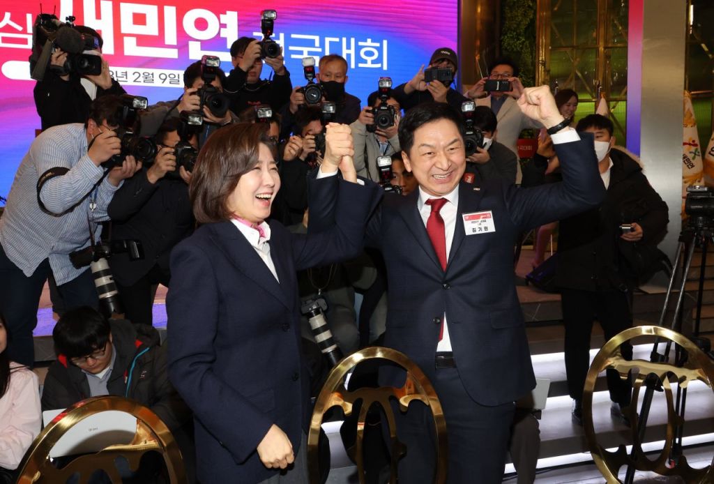 나 전 의원과 김 후보가 지난 7일 만나 사실상의 지지를 공식화한 이후 처음 만난 자리에서 두 사람은 웃으며 악수하는 등 훈훈한 분위기를 이어갔다. 손을 맞잡고 번쩍 들어보이며 인사하자 행사장 내부 참석자들은 환호하며 "김기현, 나경원"을 연호하기도 했다.
