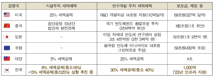 국가별 반도체 세제 및 보조금 혜택 요약표 / [이미지제공=한국반도체산업협회]