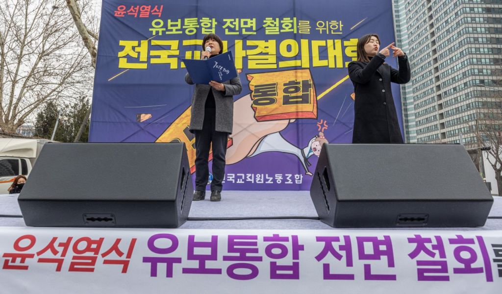 전교조는 이날 서울 용산구 대통령실 앞에서 유보통합 전면 철회를 위한 전국교사 결의대회를 열고 "유아교육의 공공성 강화라는 교육의 국가 책무성을 져버린 채 유아 공교육의 파행을 방조하는 유보통합 정책의 전면 철회를 요구한다"고 밝혔다. 이어 "교육과 돌봄은 엄연히 목적이 다른 데도 유보통합이라는 이름으로 유아교육의 정체성과 전문성이 흐려지게 되는 상황은 깊이 우려된다"고 지적했다. 이날 결의대회에는 주최 측 추산 3000여 명이 모였다.