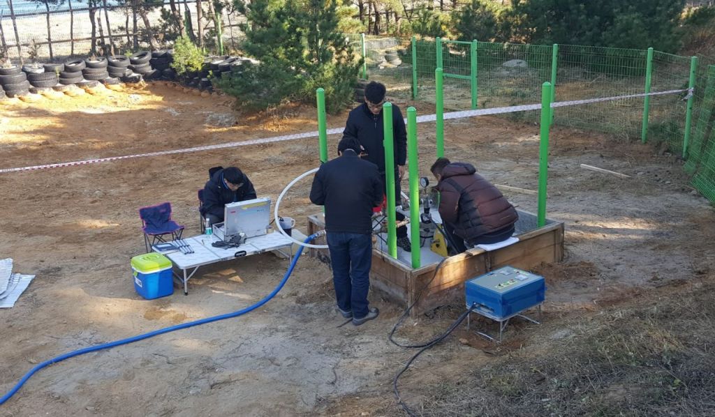 한국지질자원연구원(KIGAM) 지하수환경연구센터 연구자들이 지진-지하수 연계 모니터링을 실시하고 있다. 사진제공=KIGAM