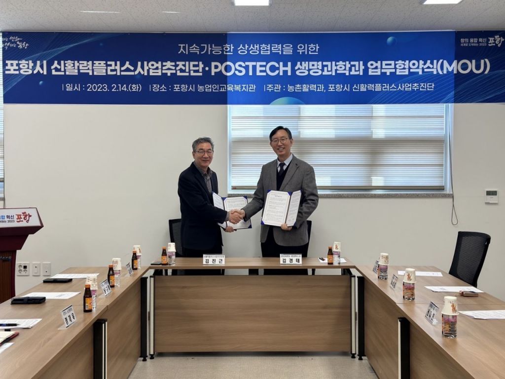 포항시 신활력플러스사업추진단은 14일 농업인교육복지관에서 포항공과대학교 생명과학과와 업무협약식을 개최했다. (김진근 추진단장(좌), 김경태 포항공대 생명과학과 교수)