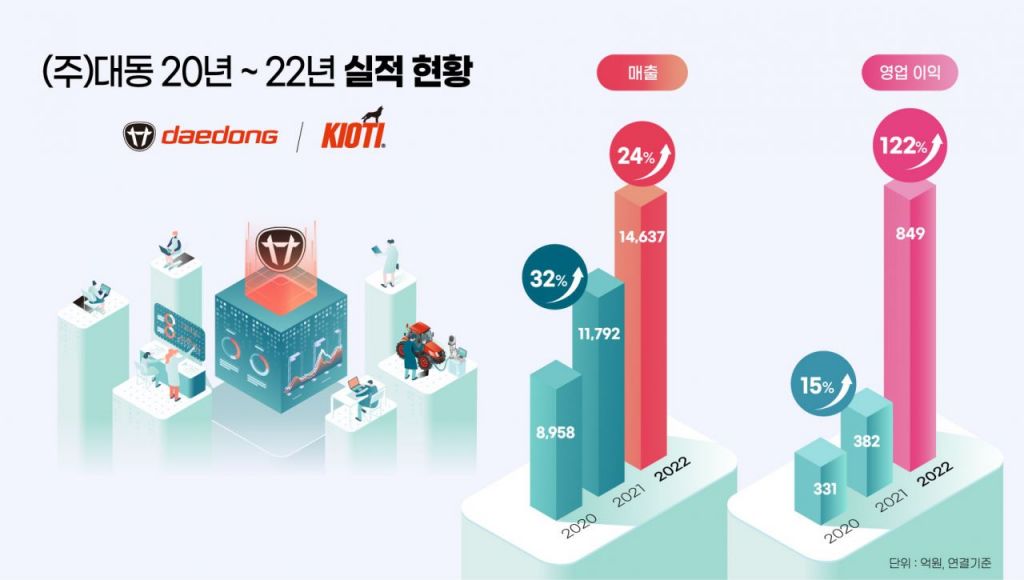 대동은 2020년부터 스마트 농기계·팜·모빌리티 3대 미래 사업을 기반으로 '애그테크&모빌리티 플랫폼 그룹'으로 혁신하기 위한 중장기 전략을 시행해가고 있다. 지난해 불확실한 경제 상황에서 조직 체질 개선과 경영 효율성 제고, 상품성 및 라인업 강화를 통한 브랜드 가치 향상, 공급망 다변화와 환율 연동제를 통한 원재료비 절감 등을 추진했다. 여기에 농기계 수출 증가와 환율 효과 등으로 최대 실적을 달성했다고 대동은 설명했다.