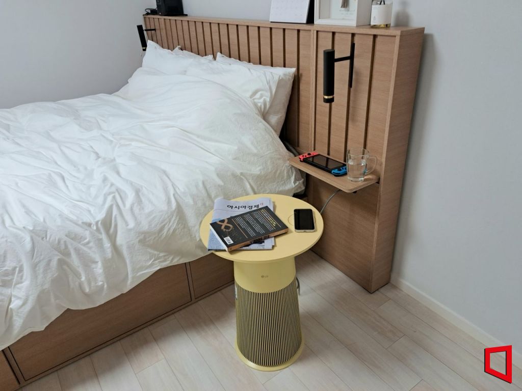 며칠간 침실에서 써보니 원형 테이블이 주는 이점이 컸다. 기존에 침대 헤드 옆에 받침이 있긴 했지만 너비가 작아 쓰임새가 한정적이었는데, 침대 옆에 기기를 두자 책과 신문, 게임기, 물컵 등 각종 제품을 두기 편했다. 스마트폰의 경우 테이블 한쪽에 마련된 스폿에 올려놓자 바로 충전이 됐다. 다른 테이블 가구나 유선 충전기 등을 복잡하게 침실에 두지 않아도 된 것이다.