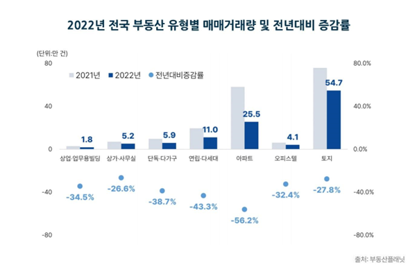 정수민 부동산플래닛 대표는 “유형별로 2022년 전국 부동산 매매 거래 데이터를 분석한 결과 2021년 대비 거래량과 거래금액 모두 급감한 가운데 아파트의 하락세가 가장 뚜렷하게 나타났다”고 설명했다.