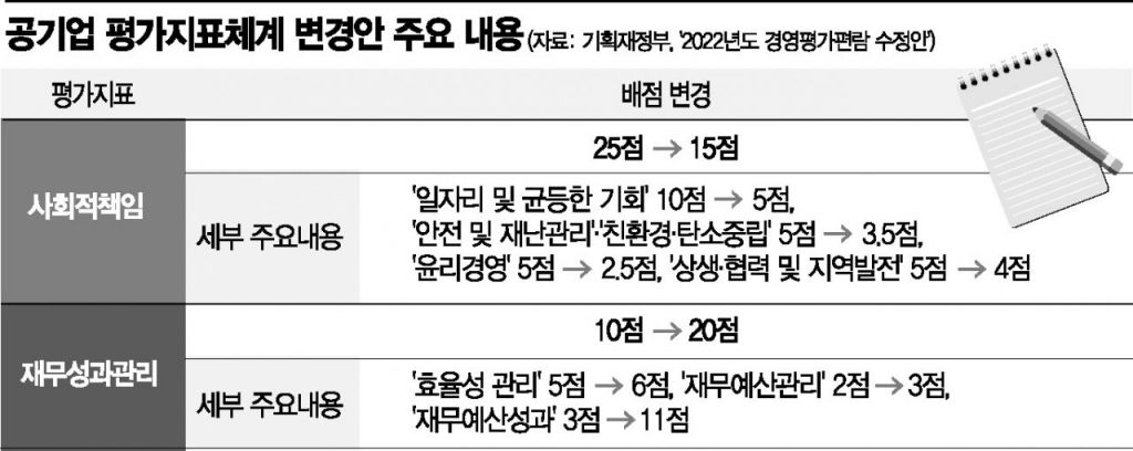 수정안의 골자는 재무성과 평가 강화다. 기존 업무효율(5점)과 조직·인사·재무관리(7점) 평가 지표를 재무성과관리(20점)와 조직·인적자원관리(4점)로 나눴다. 특히 공기업 기준 재무성과 배점을 10점에서 20점으로 두 배 확대하고, 재무예산성과 배점을 3점에서 11점으로 대폭 높였다.