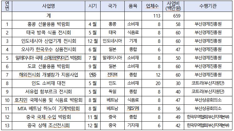 지난해 대비 약 70% 증가한 6억6000만원의 예산을 지원해 660여개 중소기업의 해외 유명 전시회·박람회 참가를 지원한다. 또 업종별 주요 전략 지역에 무역사절단을 파견해 해외 바이어와 부산 기업과의 비즈니스 미팅도 적극 지원한다.