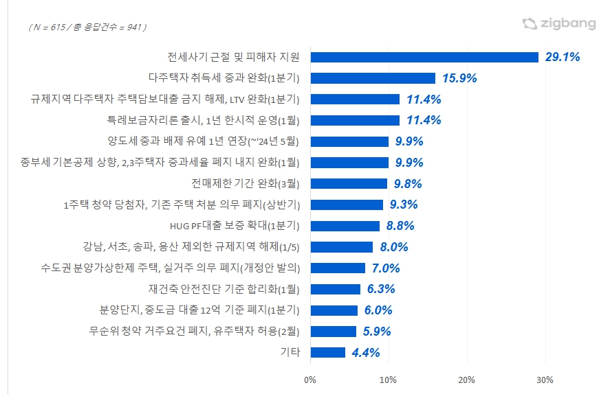 우선 올해 이미 시행되고 있거나 준비 중인 정책들 가운데 가장 관심이 크거나 기대되는 것이 무엇인지를 묻는 말에 '전세사기 근절 및 피해자 지원'이 29.1%로 가장 많이 응답됐다. 이어 △다주택자 취득세 중과 완화(15.9%) △규제지역 다주택자 주택담보대출 금지 해제, △주택담보대출(LTV) 완화·특례보금자리론 출시 1년 한시적 운영(11.4%) △양도세 중과 배제 유예 1년 연장(9.9%)·종부세 기본공제 상향, 2·3주택 중과세율 폐지 내지 완화(9.9%) △전매제한 기간 완화(9.8%) △1주택 청약 당첨자, 기존 주택 처분 의무 폐지 등의 순서로 나타났다.