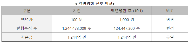 대한전선은 10대 1의 비율로 액면병합을 한다. 병합이 끝나면 보통주 액면가액은 현재 100원에서 1000원으로 높아진다. 발행주식 수는 약 12억4000만주에서 1억2400만주로 줄어든다. 자본금은 1244억원으로 병합 전과 동일하다.